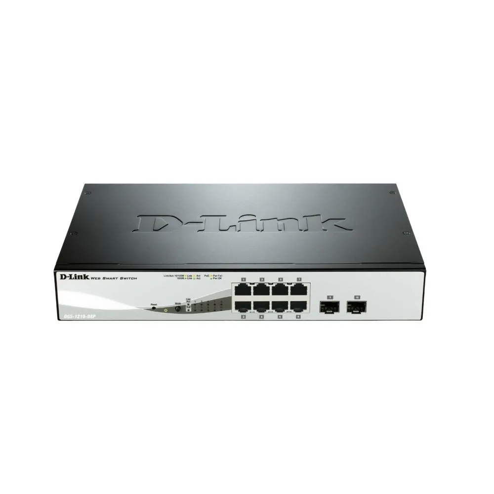 8-port 10/100/1000 Gigabit PoE Smart Switch including 2 Combo 1000BaseT/SFP, 8 x 10/100/1000Mbps Auto-Negotiating Ports, 2 x Combo 1000BaseT/Mini-GBIC SFP ports, Advance power saving features, time-based PoE, 802.3af & Pre-standard 802.3at, max PoE budget 46W, Fanless design, Half-/Full-Duplex, auto-negotiation, Auto MDI/MDIX, IEEE 802.3x Flow Control, 802.3ad Link Aggregation, Asymmetric VLAN, Auto Voice/Surveillance VLAN, LLDP/LLDP-MED, 802.1p priority queues, MAC/IP filtering, MAC/IP-based ACL, 802.1X port-base Access Control, Port Security, D-Link Safeguard Engine, Smart Console Utility, web based management, compact CLI, D-View 6.0 support, RMON, Compact 13" desktop enclosure, 19" Rackmount installationNote: Draft specifications subject to change